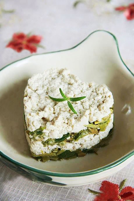 4、用小慕丝模,先铺一层香椿碎,再铺一层豆腐泥,再一层香椿碎,一层豆腐泥,每铺一层都要轻轻压紧实。