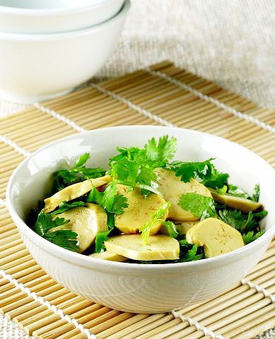 将素鸡和香菜放在一起,加上调料拌匀即可。