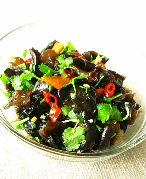 材料:黑木耳、胡萝卜、香菜、红辣椒、橄榄油、生抽、盐、香醋、糖。