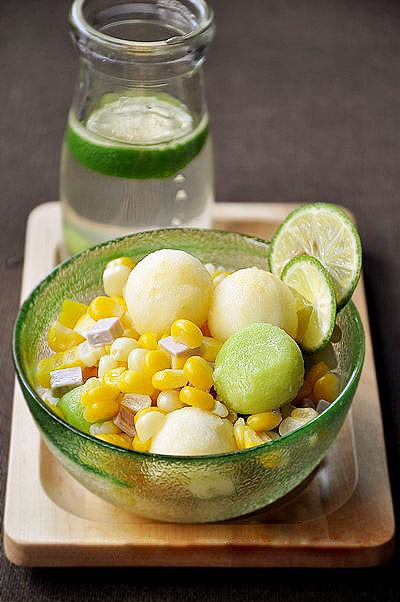 【原料】苹果1个,猕猴桃1个,甜玉米1根,蓝莓果酱
