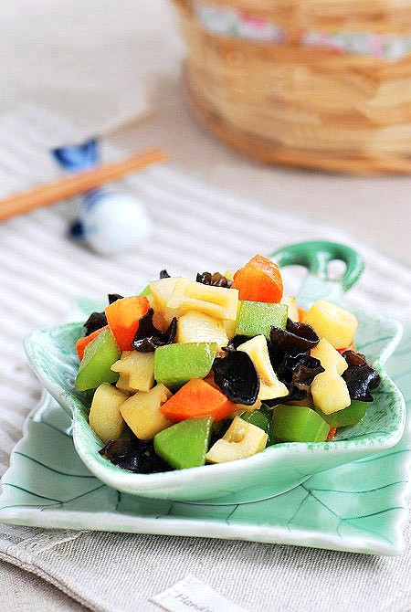 【材料】春笋、青笋(莴笋)各80克 干木耳5克 胡萝卜50克