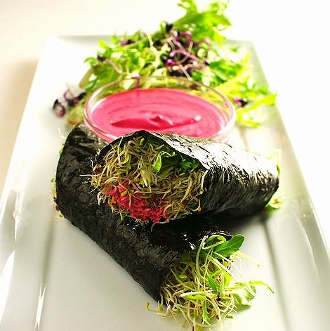 在紫菜放上您最喜爱的芽菜种类。勺一点粉红酱在上面,再放些芽菜,卷起切半。上桌时摆上粉红酱和一些蔬菜豆芽装饰。