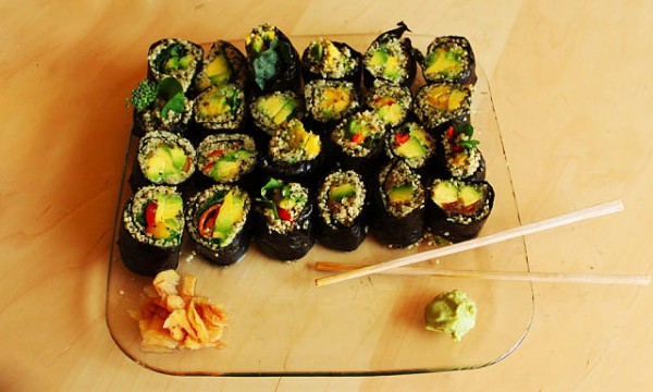姜去皮切薄片,用些许龙舌兰糖浆和柠檬汁腌3小时以上当寿司姜。