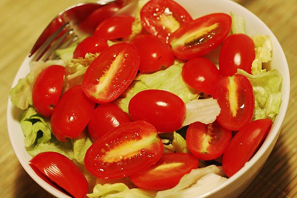 3.将番茄块与生菜片混合,调以橄榄油即成。