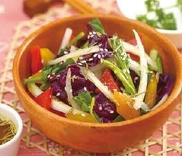 1紫甘蓝洗净掰成小块,菠菜洗净去根切段,红、黄彩椒洗净,去籽去蒂切菱形块,洋葱洗净去皮切丝,盛入大碗中备用。
