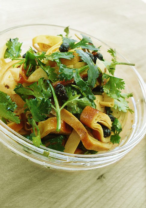 3,将豆片和香菜段放到盆中,加白糖,孜然粉,少许胡椒粉,一勺老干妈风味豆豉,少许盐(盐一定要少加),味精和香油,拌匀即可。
