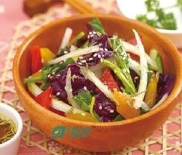 1紫甘蓝洗净掰成小块,菠菜洗净去根切段,红、黄彩椒洗净,去籽去蒂切菱形块,盛大大碗中备用。