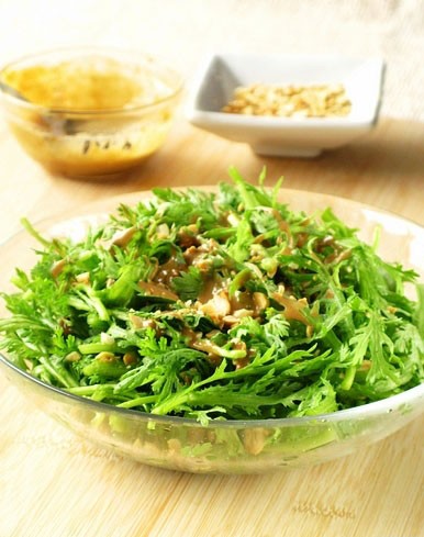 4 蓬蒿菜装盆,撒上花生碎,淋入麻酱汁即可。