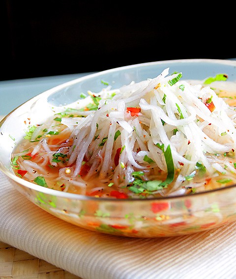 1、白萝卜洗净削皮刨丝,用1小勺经验拌匀,腌渍30分钟。