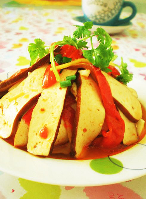 材料:香干200克,青椒1个,红椒1个,生姜、生抽、醋、芝麻油、辣椒油(如怕辣不用也可)各少许;