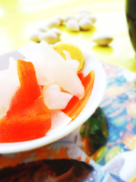 7,萝卜沥干水,放入坛子里再加两三片姜(你也可以放瓶子里)