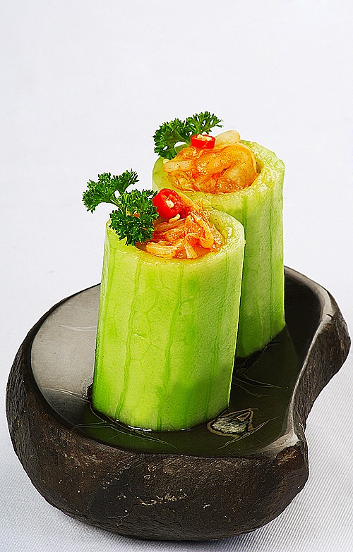 3.韩式泡菜切丝,然后填充在黄瓜空心圆圈中,用荷兰芹、小米辣圈装饰即可。