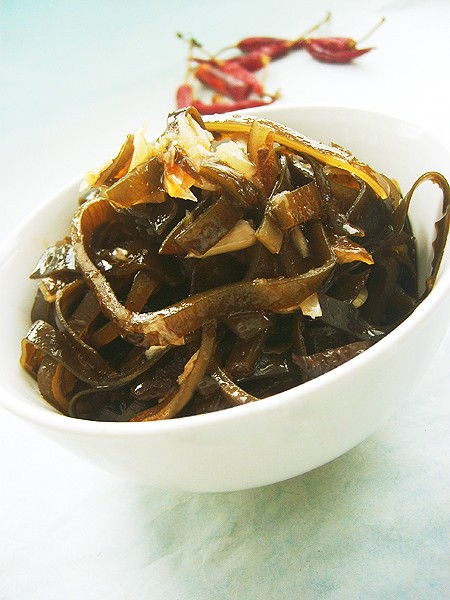 2,放在冷开水中浸泡一下(如果买来的海带丝比较生的话,就要在开水中焯一下)