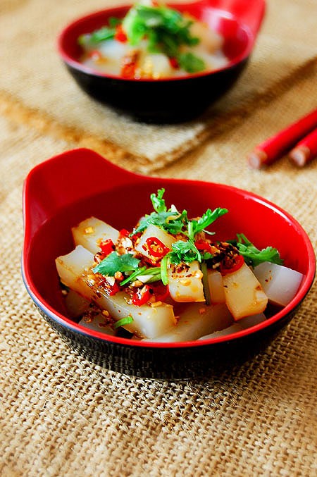 6、切成细条或者薄片,用香菜、鲜酱油、麻油、盐、糖、醋、辣椒油等佐料按自己的口味调配好,浇在凉粉上,吃的时候拌匀即可。。。