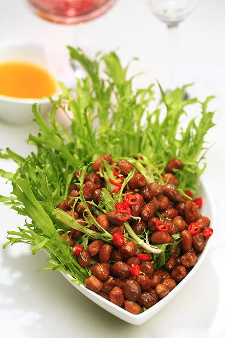 原料:花生豆、镇江香醋、苦菊、香菜、盐、白糖