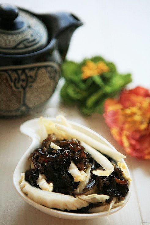 材料:木耳,白菜帮,陈醋,盐,糖,辣椒油,蘑菇精