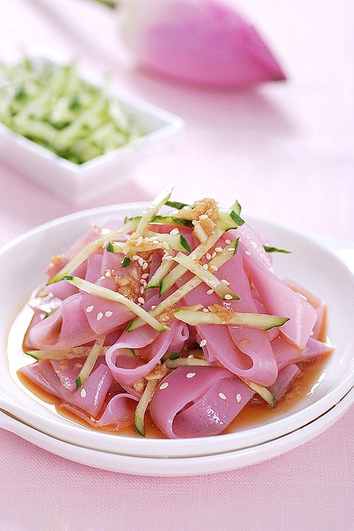 5.紫苋菜汁凉皮与普通凉皮味道上基本没有区别,做好的凉皮切好,可以加自己喜欢的调料拌匀即可,个人觉得蒜泥与辣椒油是必需。