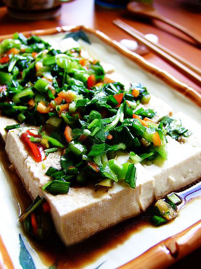 5、把拌好的剁椒连同汤汁浇在切好的热豆腐上即可。