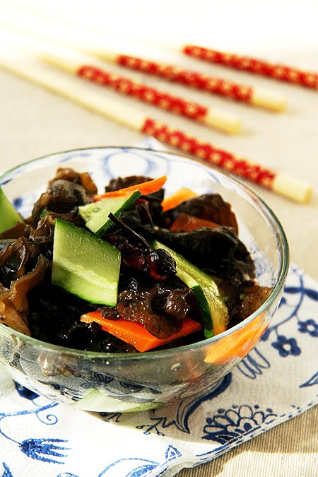 5、木耳、黄瓜、胡萝卜放入糖、盐、蘑菇精、醋、炸好的油拌匀即可。