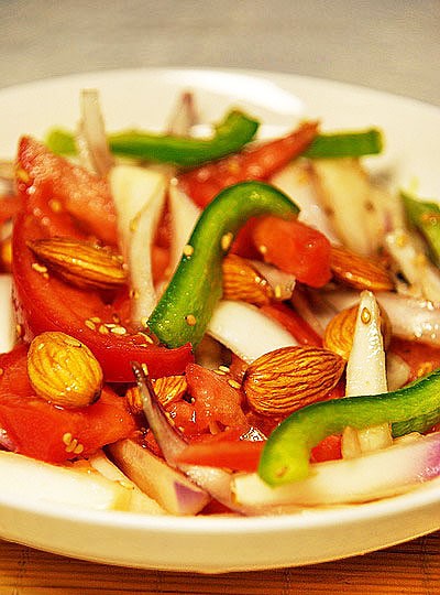 材料:西红柿 青椒 大杏仁(熟)盐醋糖芝麻油