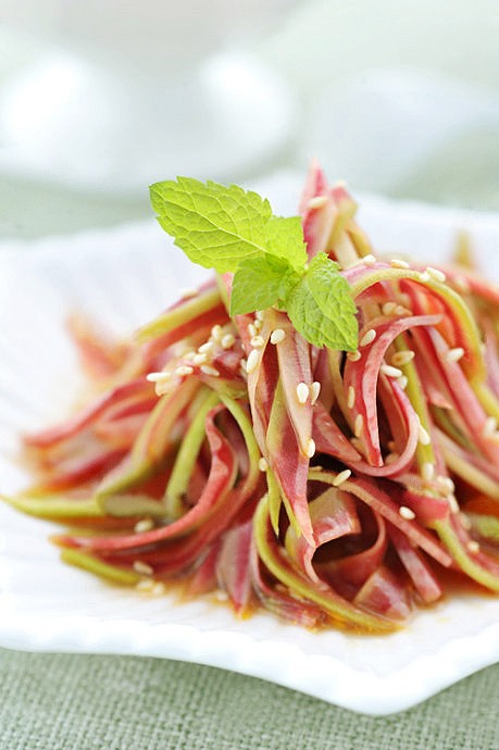 :水萝卜皮(1个萝卜的)盐1/2茶匙(3克)生抽2汤匙(30ml)米醋4汤匙(60ml)糖1茶匙(5克)辣椒油1茶匙(5ml)熟芝麻1茶匙(5克)冰块1盒