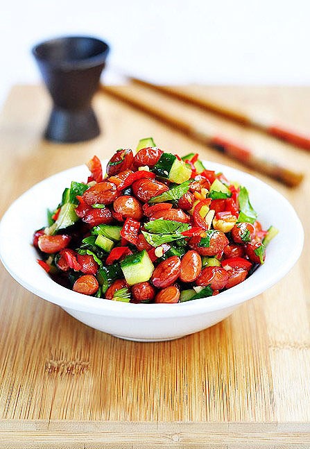 材料:花生仁100克、 黄瓜30克(去芯)、香菜3根、 小红椒2根