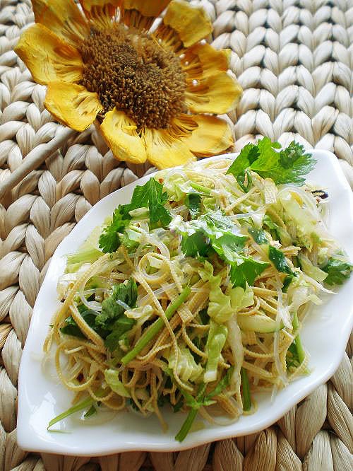 材料:白菜,干豆腐,粉丝,香菜,辣椒油,盐,糖,味精,陈醋