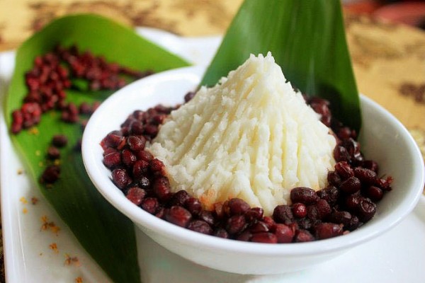 3、 红小豆加入少许果糖和桂花放进蒸笼蒸至熟烂拿出、取些许蒸好的红小豆围在摆好的山药泥的边上即可。