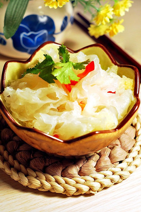 4.将银耳装入容器中放入适当盐、白醋、少量白糖、味精、香油调拌均匀即可食用