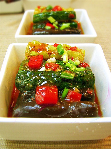 【原材料】苦瓜、茄子、黄瓜各100克、姜5克、红椒1/2个。