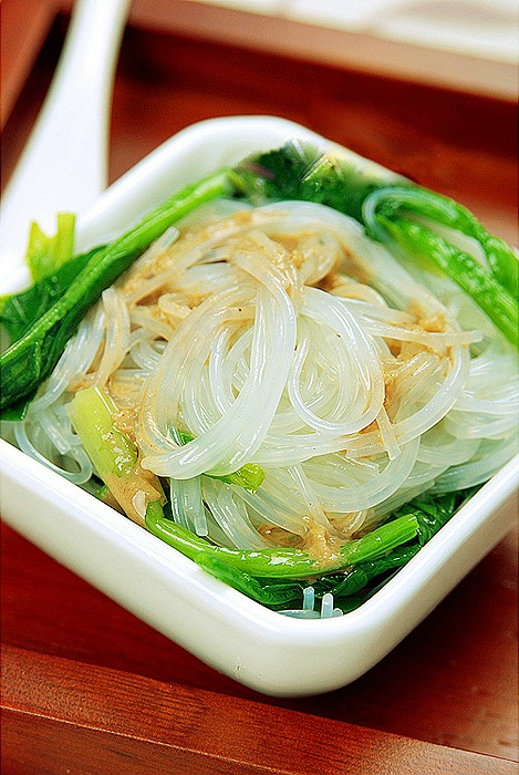 菠菜粉丝分别热水焯烫一下。芝麻酱里加入花椒油,米醋,盐拌匀,倒入焯好的粉丝菠菜里,加几滴香油,拌匀即可。
