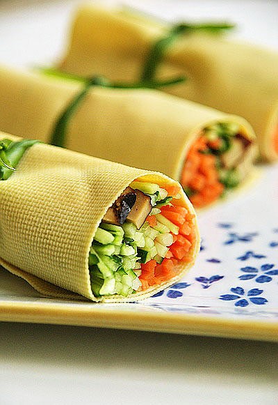 做法:胡萝卜和黄瓜洗净后加上豆腐干一律加丝,豆腐皮剪成方形小块。把各种丝按比例放在豆腐皮一端,卷起后两头系好,然后切段装盘就可以了,吃的时候可以沾些腐乳汁或生抽食用。