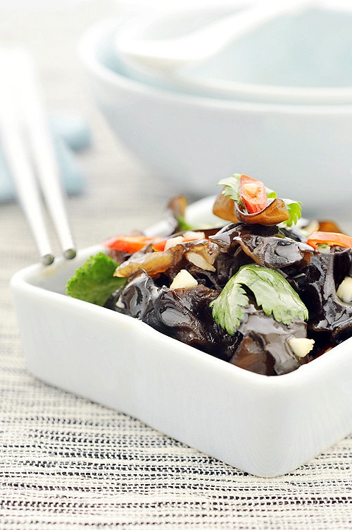 5) 将木耳,香菜,小米椒混合在一起,倒入辣椒油和调好的汁,拌匀即可食用。
