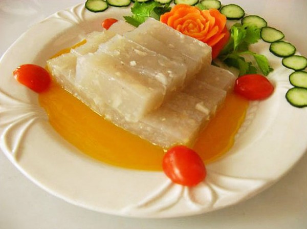 不要关火慢慢的把和好的粉水倒进在煮的水、边倒边不停的拿一根勺子搅动,倒完煮熟成稠稠的,出锅倒入凹体形的平底铁盘中待凉,放入冰箱冷藏5个小时[是冷藏哦不是速冻哦] 然后切成块状用果酱点缀即可。