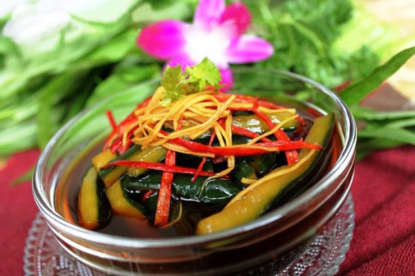 3、将调好的酸辣汁倒入挤干过的黄瓜条上包上保鲜、再放进保鲜柜浸泡两个小时左右、拿出装入盛器中既可。