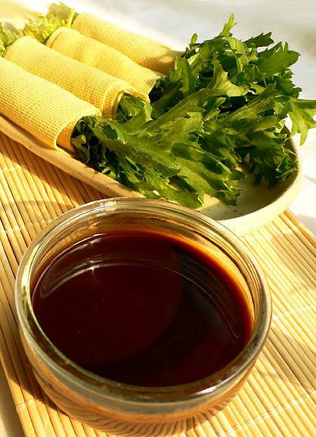 2、将苦菊苣放在豆皮上,卷成蔬菜卷,蘸酱食之。