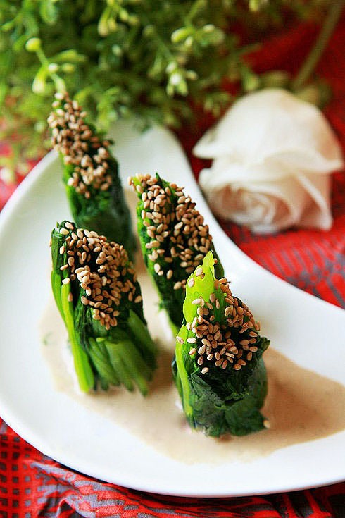 5,我们把冰镇的菠菜卷取出,然后打开锡纸,用刀切成一面成春笋样子的斜面,然后在斜面上沾上芝麻。