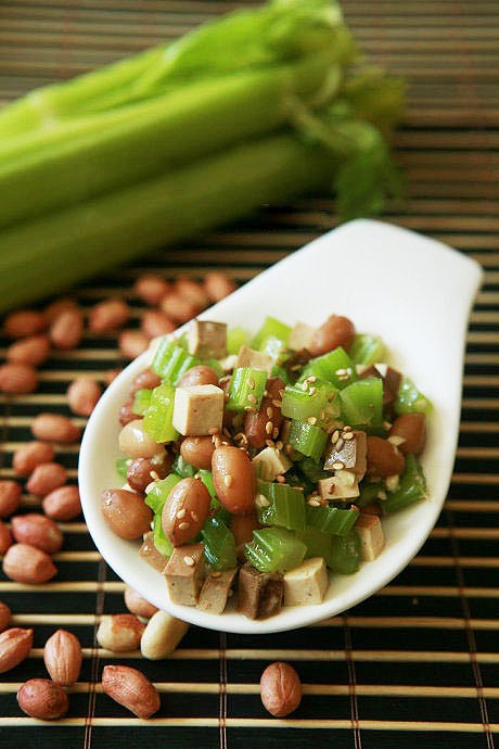 2,把豆腐干和西芹都切成小丁。然后放入开水中焯一下,捞出过凉水。