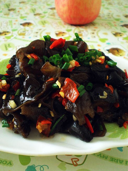 材料:干云耳10克,剁辣椒适量,芝麻油、生抽、姜各少许;