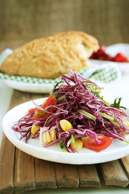 原料:紫甘蓝、甜脆玉米、樱桃西红柿、香菜、香醋、香油、盐、胡椒粉、白糖