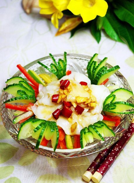 10.青、红椒、黄瓜切细丝,铺在盘底;