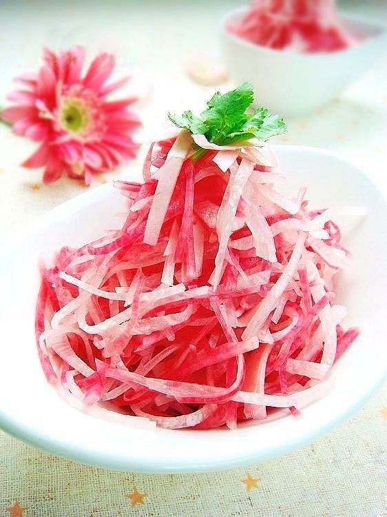 1、白萝卜和心里美萝卜洗净去皮,切丝。