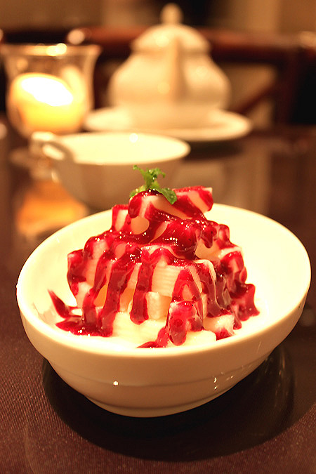 3、将腌制过的山药放在盘上,涂上蓝莓酱即可。