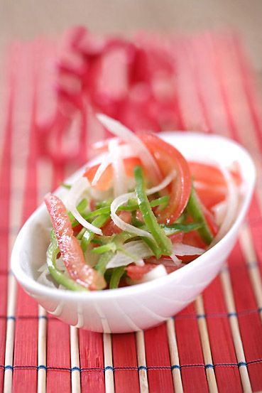 原料:辣椒1根、西红柿1个、醋1汤匙(5ml)、盐1/2茶匙(3ml)、糖1/4茶匙(1克)、味精1/4茶匙(1克)、香油1/4茶匙(1ml)