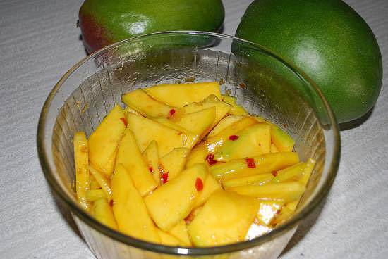 芒果去皮、切片,用一茶匙盐腌制大约10分钟