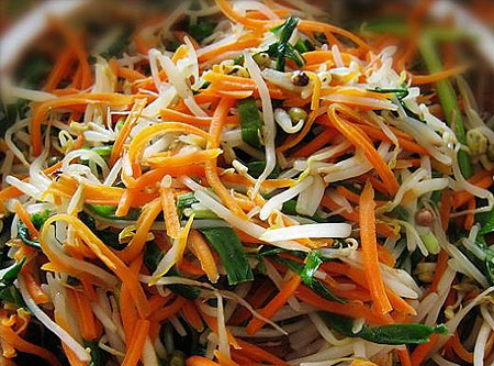 当今世界,“天然”、“健康”食物引领风骚,豆芽就是其中之一。豆芽营养丰富,加上在发芽过程中,维生素C含量增加很多,而且部分蛋白质也分解为各种人体所需的氨基酸,更有利于人体吸收,营养更胜一筹,是素食者的最佳选择。今天介绍的是一道素菜:三彩银芽。