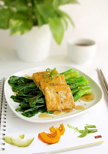 材料:北豆腐......300克、芥蓝......150克、姜末......少许、素耗油......5ml、盐......少许、水淀粉......少许、素高汤......适量、白糖......少许