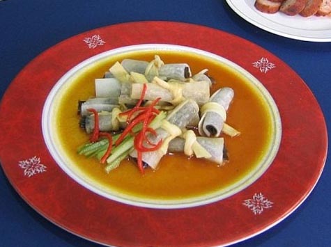 3、白萝卜片包海带结、嫩姜丝卷起,再以胡瓜干丝绑紧。
