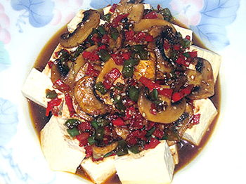 5、将蒸好的豆腐排入盘中,将炒好的蔬菜淋在上面即可。
