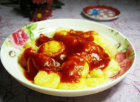 3、起锅放少许水煮开放入番茄酱煮开,加少许淀粉水勾芡一下,然后浇在豆腐上即可。